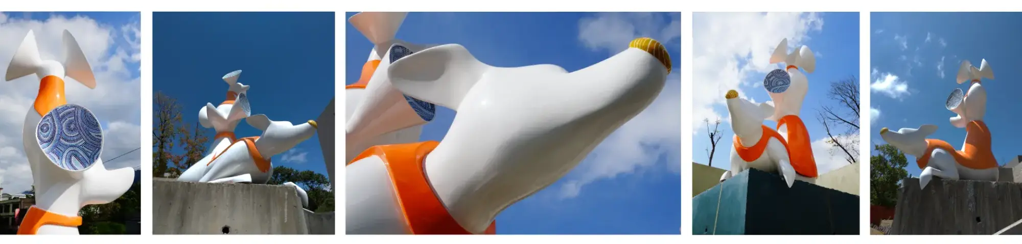 本案策畫以在地特色為核心,於平溪與大埔兩分隊設置公共藝術。大埔作品設於搜救犬舍前停車場邊角,以犬為發想,透過潔白俐落的造型展現搜救犬形象,傳遞消防員與搜救犬並肩作戰的精神。期望藉由兩地公共藝術的設置,傳達消防使命,形塑兼具美感與親和力的空間,讓民眾感受安心,也讓消防員在高壓工作中獲得心靈舒緩與支持。