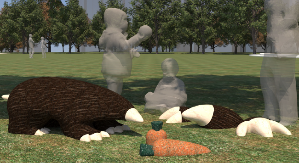 設置於公園中央翱翔草原東側,鄰近社區活動中心。作品以街道家具的形式呈現,結合功能性與動物活潑造型,吸引民眾與之產生互動,休憩或是遊玩,與動物們一同共創嶄新的故事。